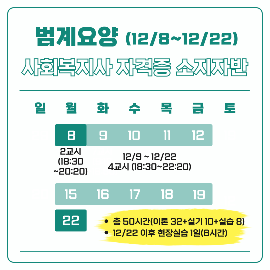 모집중 25년도 12월 요양보호사 자격취득과정(사회복지사반) 야간반